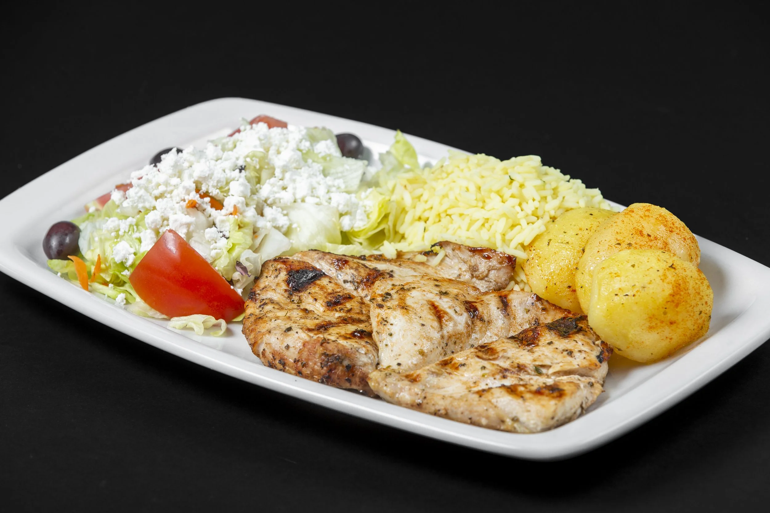 Served with rice, roast potatoes, greek salad, dinner roll & tzatziki